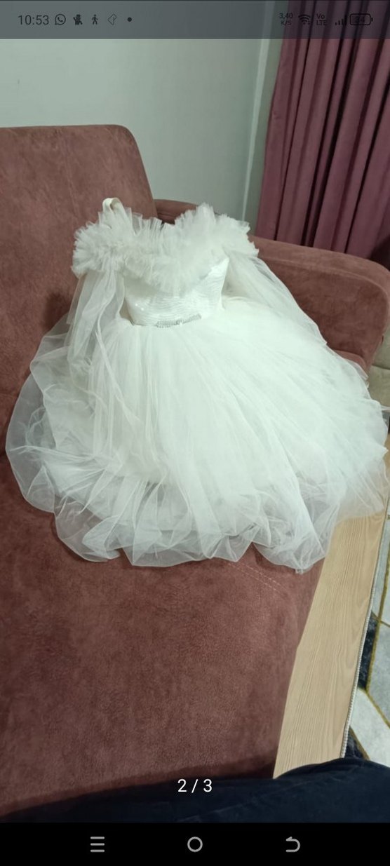Kolsuz, tek renk beyaz elbise, tekne yakalı ve fırfırlı detaylara sahip, hafif sentetik kumaştan bohem tarzda kesim. Kolları tulle kapatılma detay ayrı bir güzellik katıyor . Tarlatanlı cocuk gelinliğimiz bir defa giyildi.