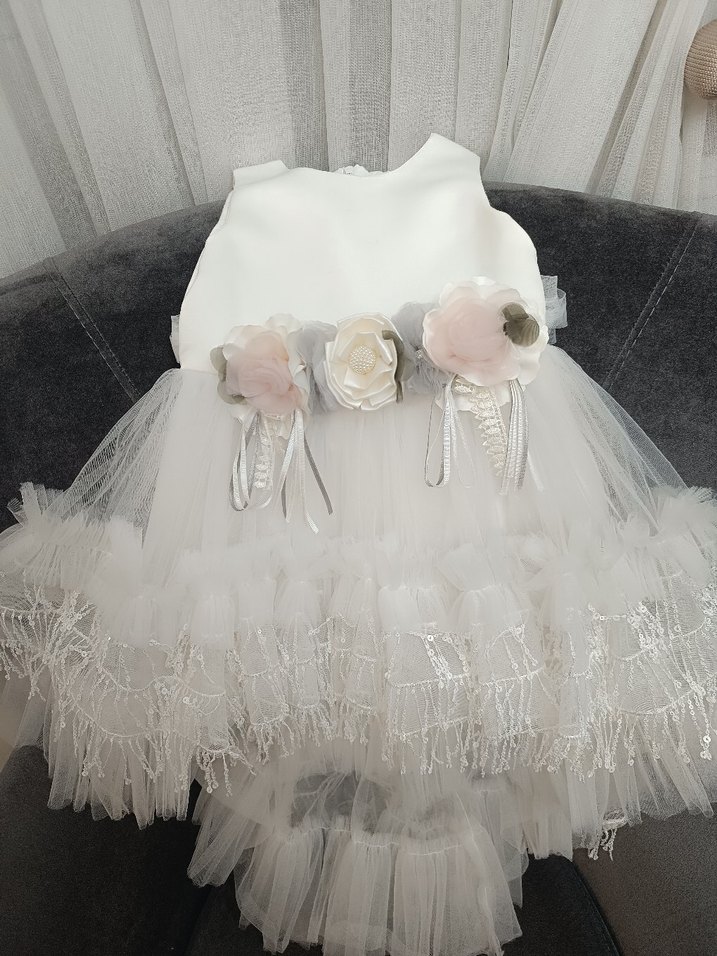 Fırfırlı ve nakışlı detaylara sahip straplez, beyaz, dar kesim kız çocuk elbisesi. Yumuşak sentetik kumaştan üretilmiştir. 4 yaş boyu 60/80 santim