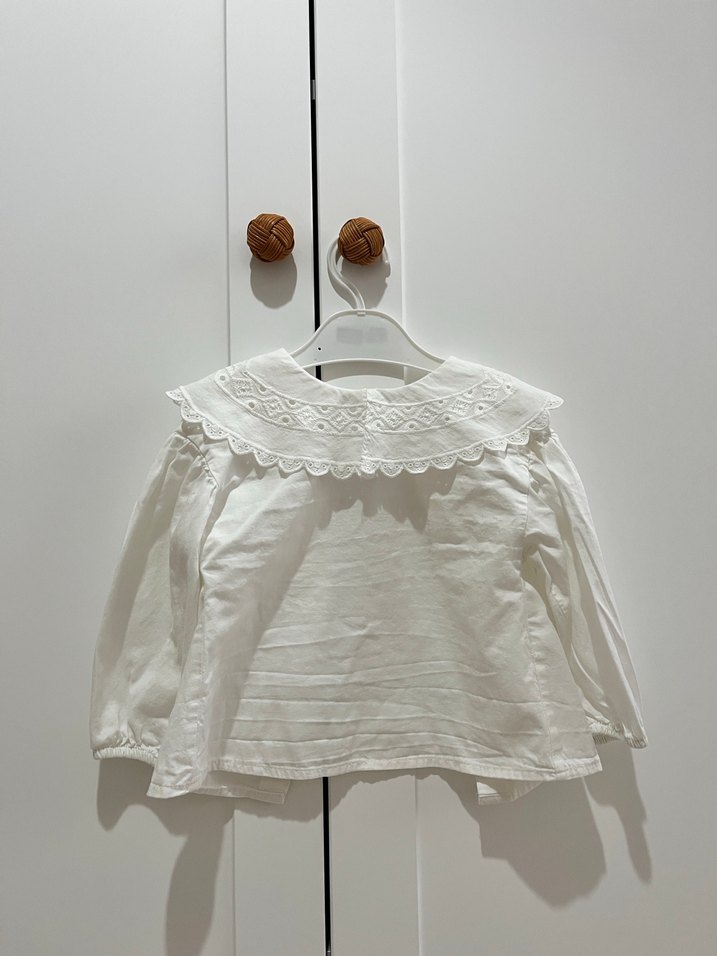 Kız çocuk beyaz keten gömlek, yakası fırfırlı ve nakışlıdır. Hafif keten kumaştan, bol kesim ve uzun kolludur, bohem tarzındadır. 9-12 ay biz iki yaşa kadar kullandık. Kolları sırıtmadı kısa model gibi durdu.