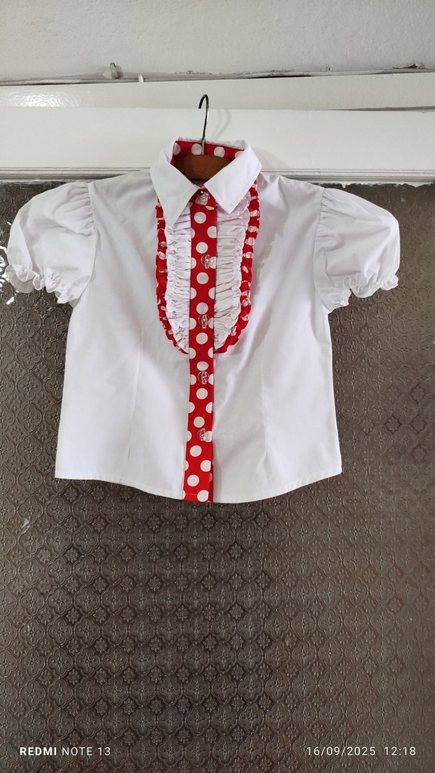 Kız çocukları için pamuklu, kısa kollu, beyaz gömlek. Ön kısmında kırmızı puantiyeli fırfır detayları ve yakalı tasarım bulunur. ürün kullanılmamış sıfırdır 2 kol arası 38 cm boy 42 cm