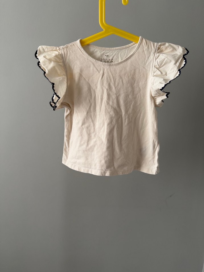Beyaz renkli kız çocuk tişörtü, kısa fırfırlı kollar ve yuvarlak yaka ile pamuklu, rahat kesime sahip.