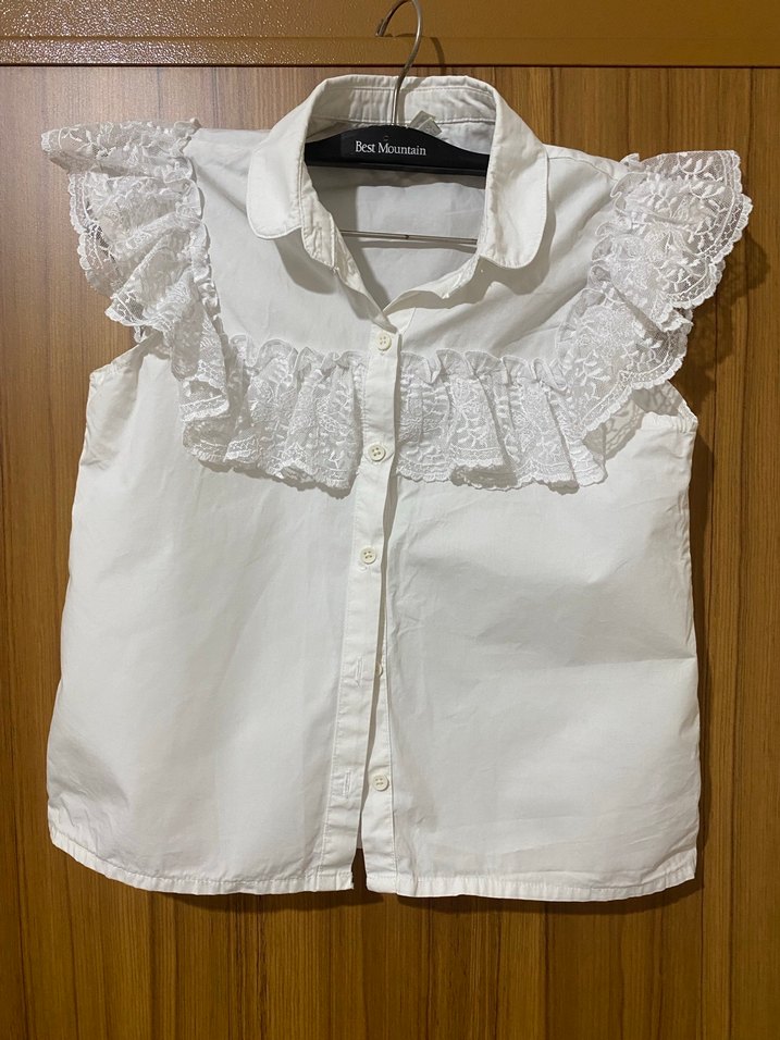 Kolsuz beyaz pamuk gömlek, yakalı ve bol kesimdir. Nakışlı fırfır detaylarıyla bohem tarzını yansıtır. Tertemiz