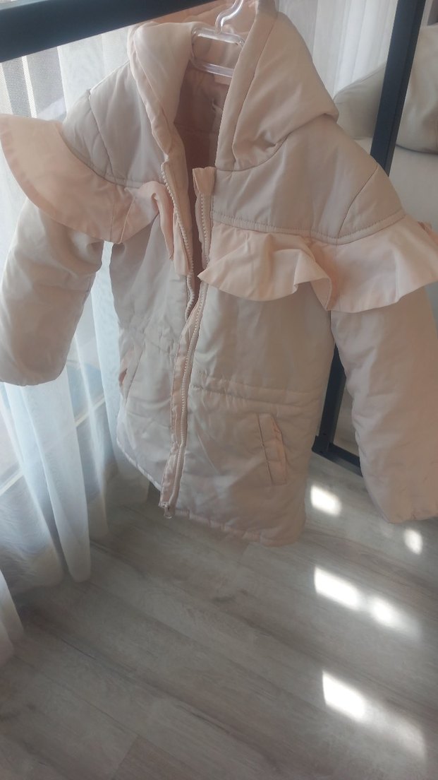 Fitted kesim kız çocuk montu, pastel beyaz renkte ve fırfır detaylıdır. Yumuşak sentetik kumaştan, sade ve desen içermeyen streetwear tarzında üretilmiştir.