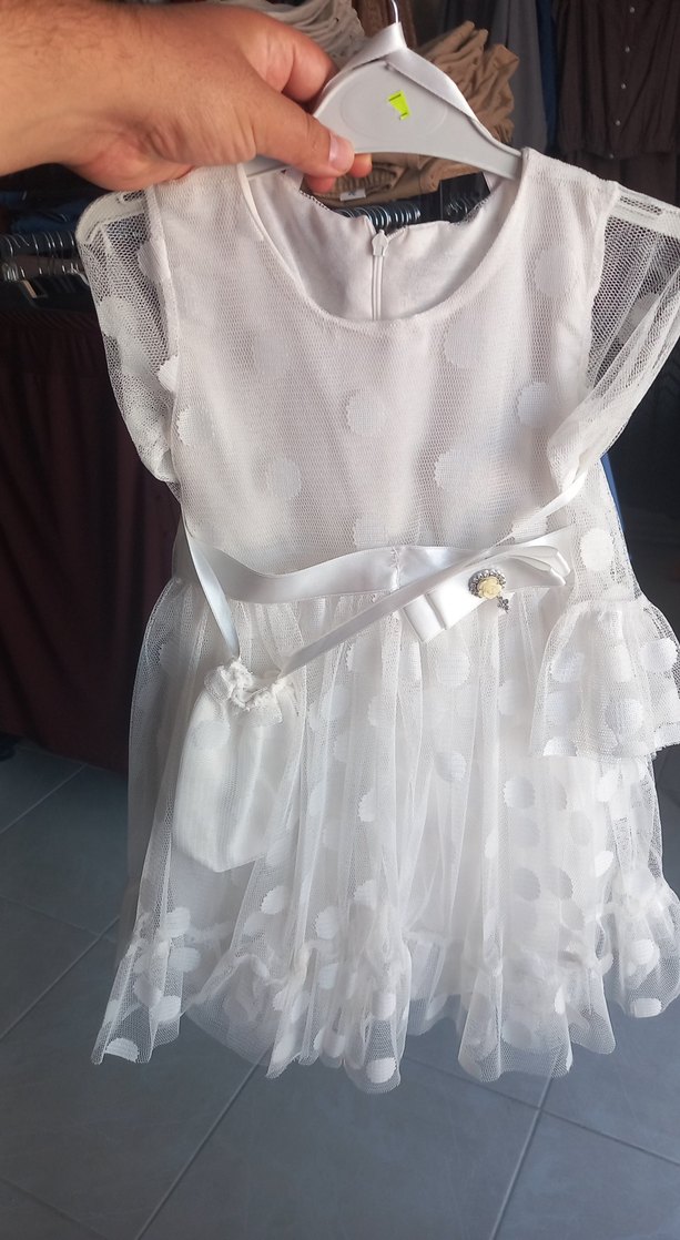 Beyaz, fitted kesim kız çocuk elbise, askılı kollu ve yuvarlak yaka. Nakışlı desenler ve fırfır detaylarıyla bohem tarzda, yumuşak sentetik kumaş.