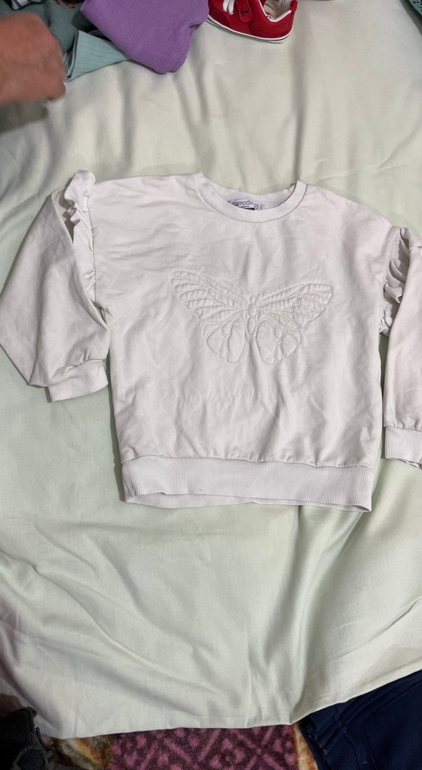 Kız çocukları için uzun kollu, yuvarlak yakalı, bol kesim beyaz sweatshirt. Yumuşak keten kumaştan, kollarında fırfır ve önünde nakışlı kelebek deseni bulunur.