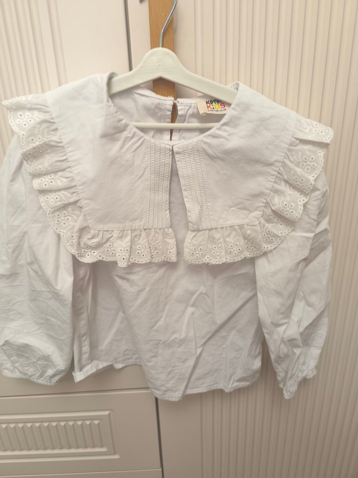 Yumuşak pamuktan üretilmiş, bol kesim beyaz kız çocuk bluz. Uzun kollu ve yakalıdır, nakışlı detaylar ve fırfır tasarım bohem bir hava katar.