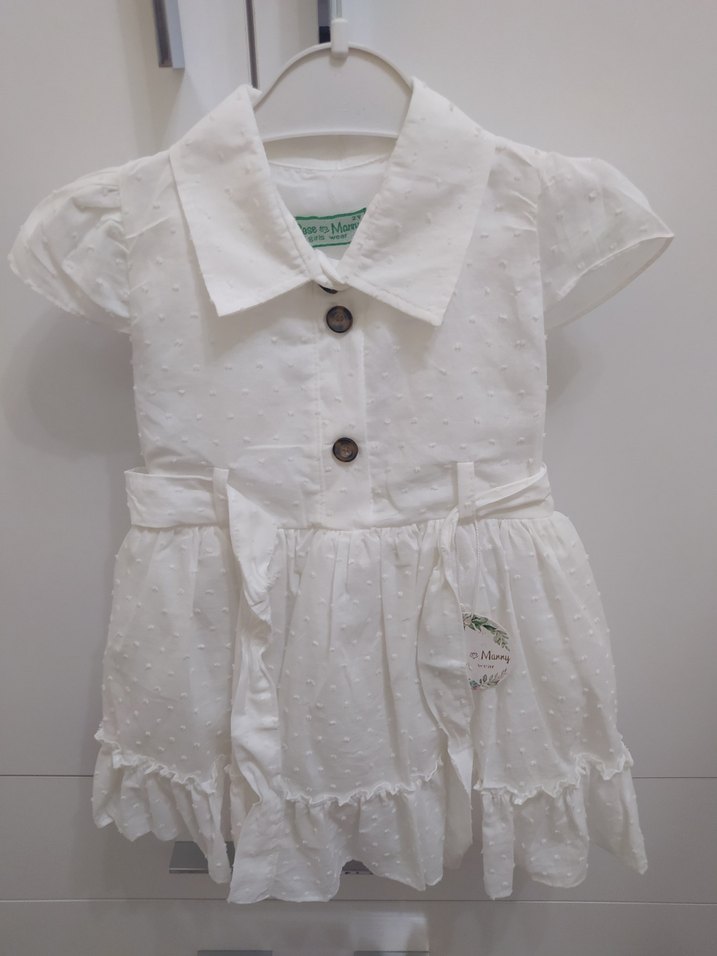 Pamuklu beyaz kız çocuk elbisesi, kısa kollu ve yakalıdır. Nakışlı desenler ve etek kısmında fırfırlar bulunur, bohem tarzı yansıtır. sıfır etiketli ürün
