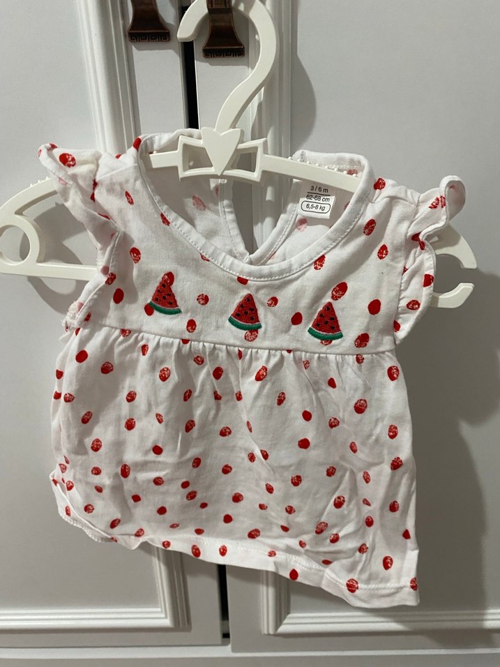 Pamuklu, kolsuz, V yaka ve fırfırlı kız çocuk elbisesi. Renkli kiraz ve karpuz desenleriyle sokak stiline uygun.