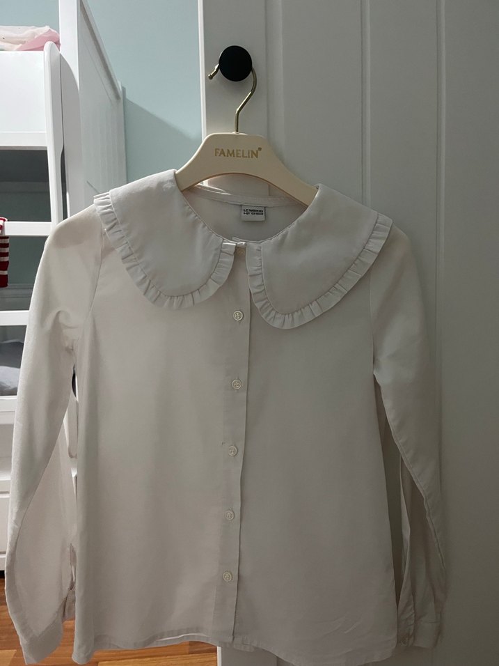 Beyaz kız çocuk gömleği, fırfırlı yakası ve uzun kollu tasarımıyla pamuklu, bol kesim ve sade normcore tarzındadır. kucuk geldigi icin satiyorum defosu vs yok