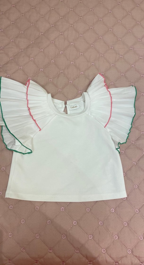 Pamuklu beyaz kız çocuk tişörtü, kısa kollu ve pastel renklerde fırfır detaylıdır. Yuvarlak yakalı ve bol kesimdir, nakışlı deseniyle sade bir şıklık sunar.