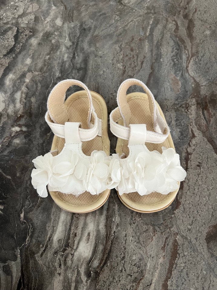 Beyaz renkli, kauçuk tabanlı kız çocuk sandalet. Çiçek desenli fırfır detayları ve bohem tarzıyla hafif ve rahat.