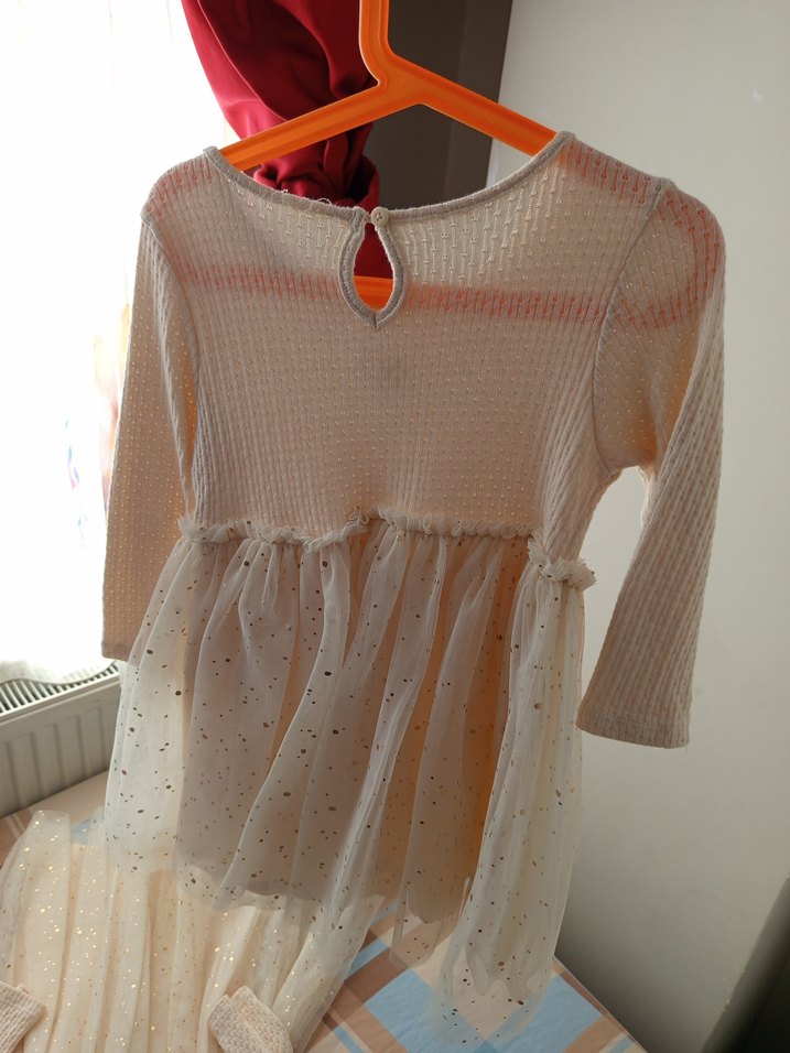 Beyaz renkli, uzun kollu, fırfırlı detaylara sahip örme kumaş elbise. Salaş kesimi ve yuvarlak yakası ile bohem tarzda şık bir görünüm sunar. 3/4 yaş etiketi yok