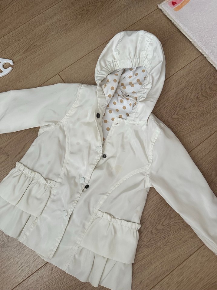 Kız çocukları için beyaz renkli, sentetik kumaştan yapılmış, fırfır detaylı ve notched lapel yakalı bol kesim yağmurluk. İç kısmı puantiyeli desenlidir, günlük sokak stili için uygundur. ️