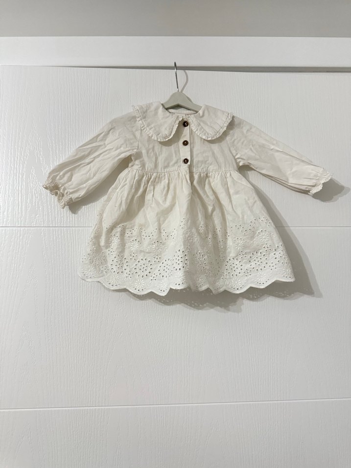 Uzun kollu, pamuklu beyaz elbise, fırfırlı yakası ve nakış detaylarıyla. Rahat kesimli ve bohem tarzda, pastel tonlarda şık bir seçim.