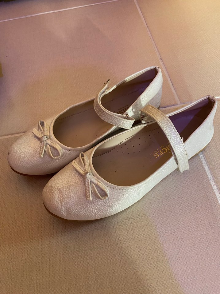 Kız çocukları için beyaz renkte, fiyonk detaylı ve bilek bantlı babetler. Yumuşak kauçuk malzemeden, modern klasik tarzda, pastel tonlarda ve desensiz,kendinden simli.Ufak deformesi var son resimde mevcut