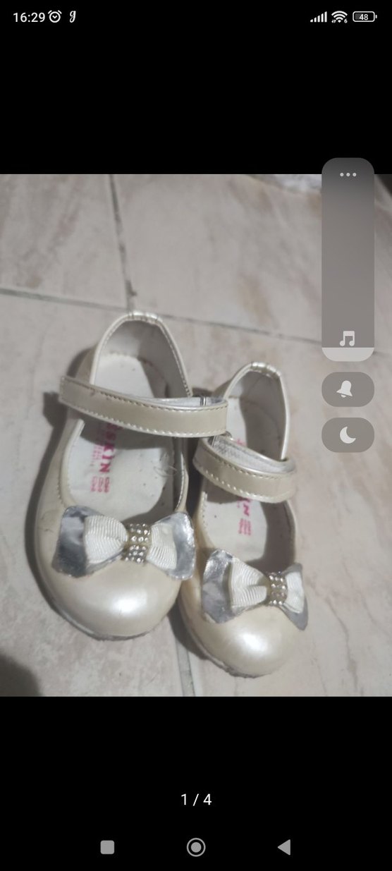 Kız çocukları için beyaz renkte, fiyonk detaylı ve lastik malzemeden yapılmış klasik tarzda babetler.