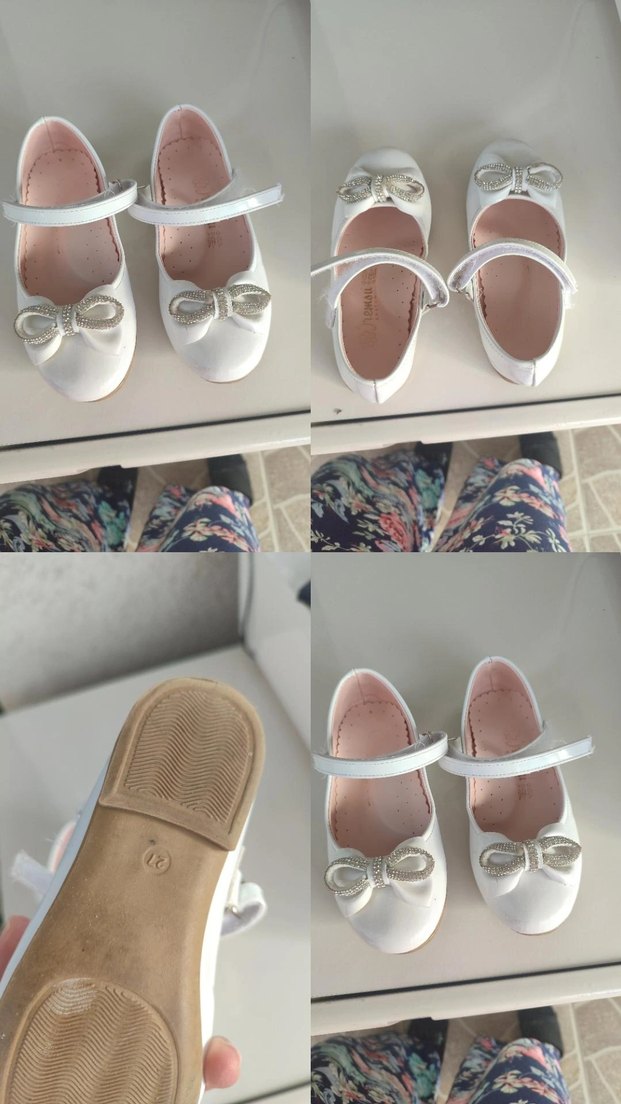 Beyaz kız çocuk babetleri, fiyonk detaylı ve ayarlanabilir bantlıdır. Kauçuk malzemeden yapılmış, düz ve hafif tasarıma sahiptir.