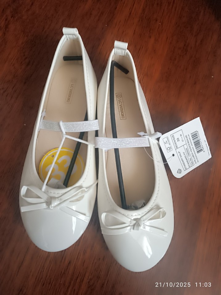 Kız çocukları için beyaz renkli, modern klasik tarzda, fiyonk detaylı ve rahat kauçuk tabanlı babetler. Açık renk ve desensiz tasarım. biri 33 diğeri 34 numara