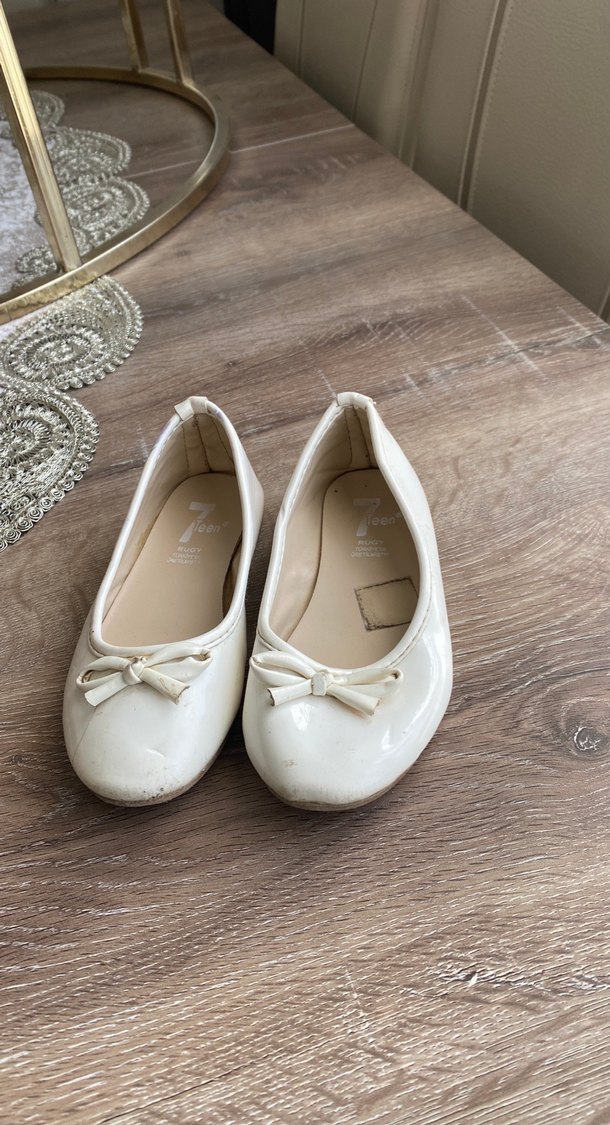 Beyaz pastel renkte, fiyonk detaylı kız çocuk babetleri. Rahat kauçuk malzemeden, modern klasik tarzda tasarlanmıştır.