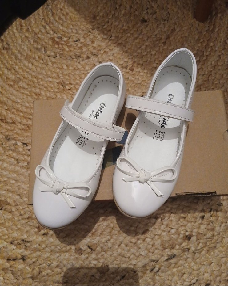 Okul gösterisi için 1 kez giyildi. Hakiki deri full ortopedik taban. Kız çocukları için beyaz, fiyonk detaylı ve kauçuk tabanlı klasik tasarımlı babetler.