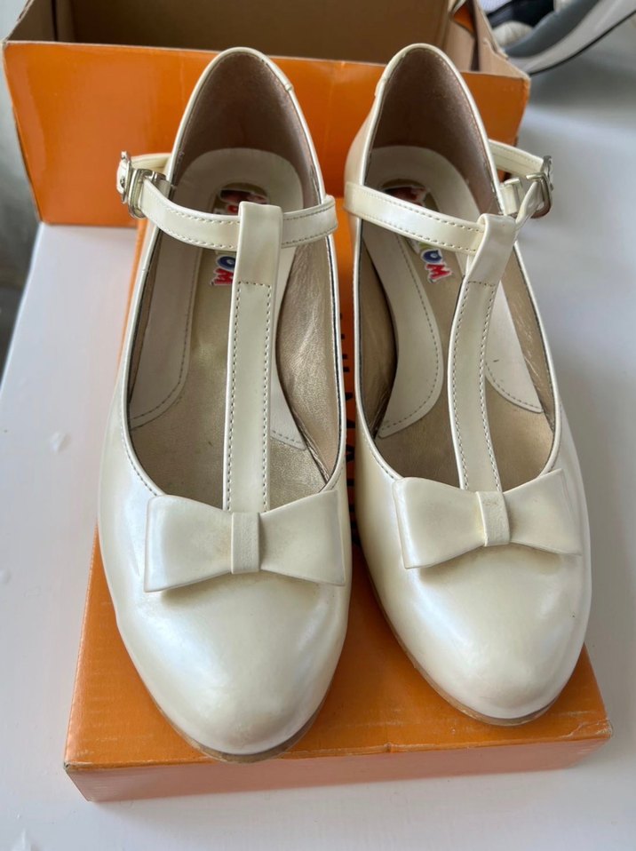 Beyaz renk, tokalı bant ve fiyonk detaylı kız çocuk babeti. Klasik tarzda, desensiz ve açık tonda. Bebetom marka Ortopedik taban bir kez giyilmiş yeni gibi topuğu iki parmak yüksekliğinde 36 numara sıfırdan farksız parlak krem rengindedir
