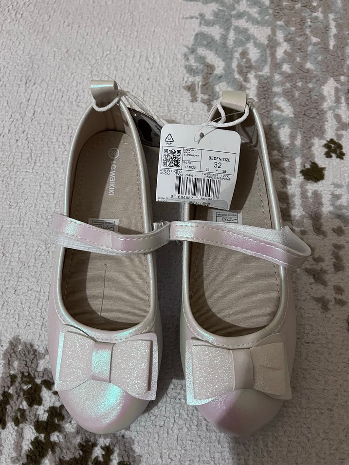 Beyaz renkli kız çocuk babetleri, fiyonk detayı ve yumuşak kauçuk tabanıyla modern klasik tarz sunar. ✨ daha sıfır etiketi üzerinde