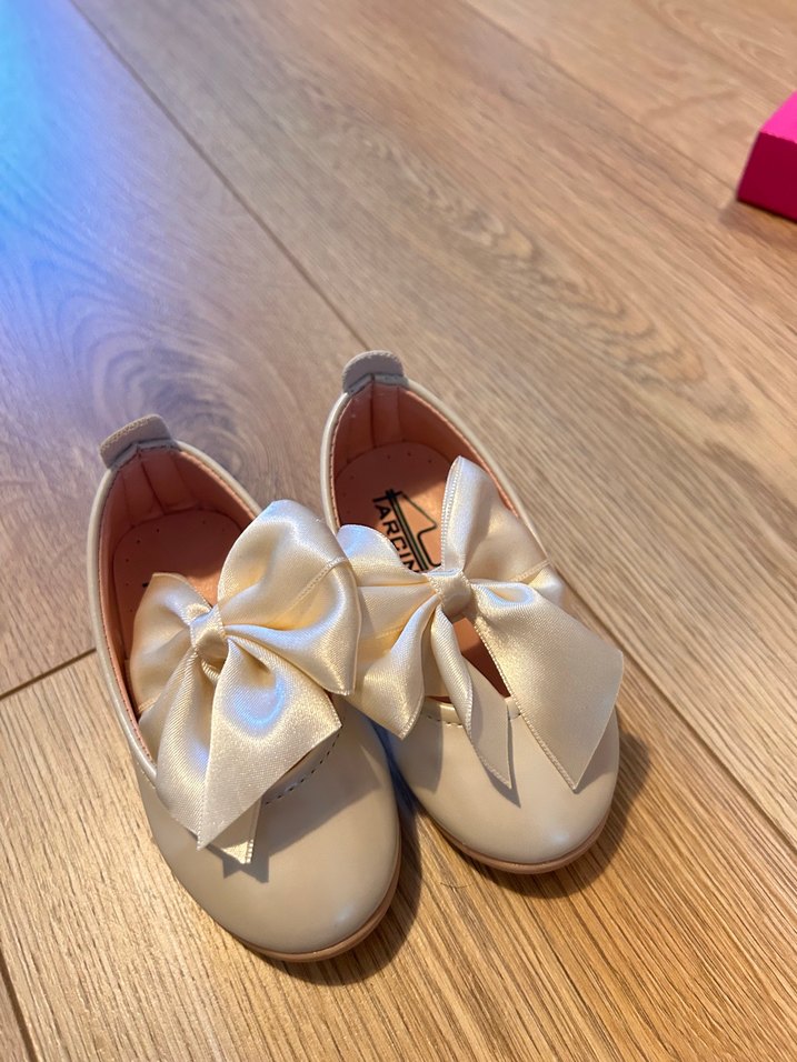 Beyaz kız çocuk babetler, büyük saten fiyonk detayıyla, modern klasik tarzda, kauçuk malzemeden üretilmiştir.