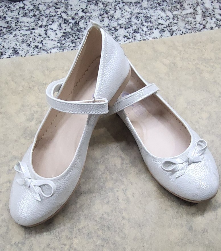 Kız çocukları için beyaz renkte, fiyonk detaylı ve yumuşak kauçuk tabanlı modern klasik tarzda babet ayakkabı. 2 kez bayramlarda giyildi