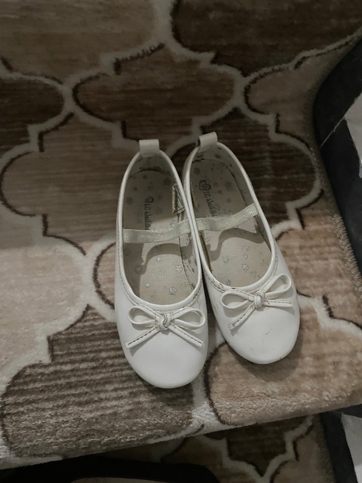 Beyaz renkli, fiyonk detaylı kız çocuk babeti. Yumuşak kauçuk malzemeden yapılmış, şık ve sade tasarımda, bantlı modeldir. Az giyildi.
