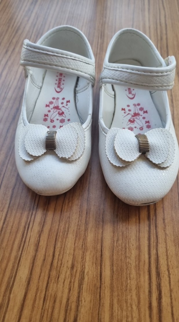 Beyaz renkli kız çocuk babetleri, nakışlı desen ve önde fiyonk detayıyla. Yumuşak kauçuk malzeme ve klasik tarzda bantlıdır.