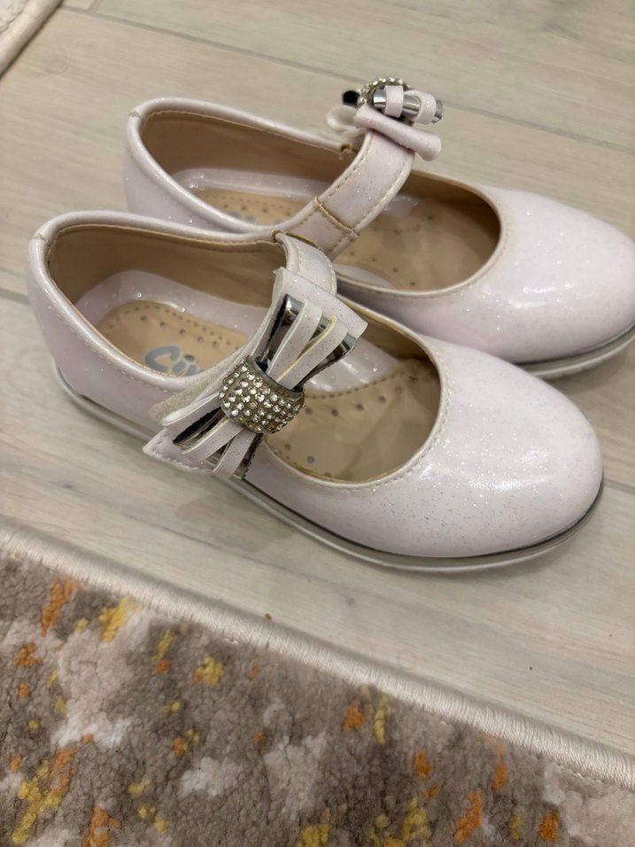 Kız çocukları için beyaz babetler, fiyonk detayı ve hafif yılan deseni ile. Konforlu kauçuk tabanlı. ✨