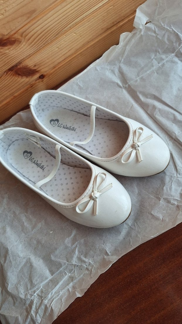Kız çocukları için beyaz renkli, yumuşak tabanlı, fiyonklu klasik babetler. Pastel tonlarda, sade ve şık tasarıma sahiptir. bir kere nişanda kullanıldı sorunsuz