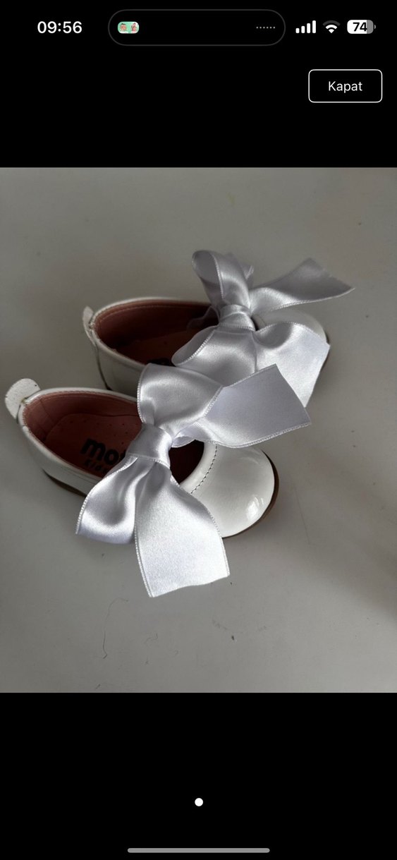 Kız çocukları için beyaz renkte, büyük saten fiyonk detaylı, pürüzsüz kauçuk yüzeyli modern ve şık babetler. Ürün sıfırdır bebeğimin ayağına olmadı ikizlerim olduğu için de iade süresini geçirdik.