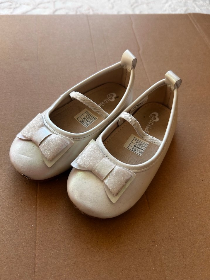 Kız çocukları için beyaz renkli, yumuşak kauçuk malzemeden yapılmış, fiyonklu modern klasik tarzda babet. sol tekinin burun kısmında hafif bir kalkma var. 1 kez doğum gününde giydi.