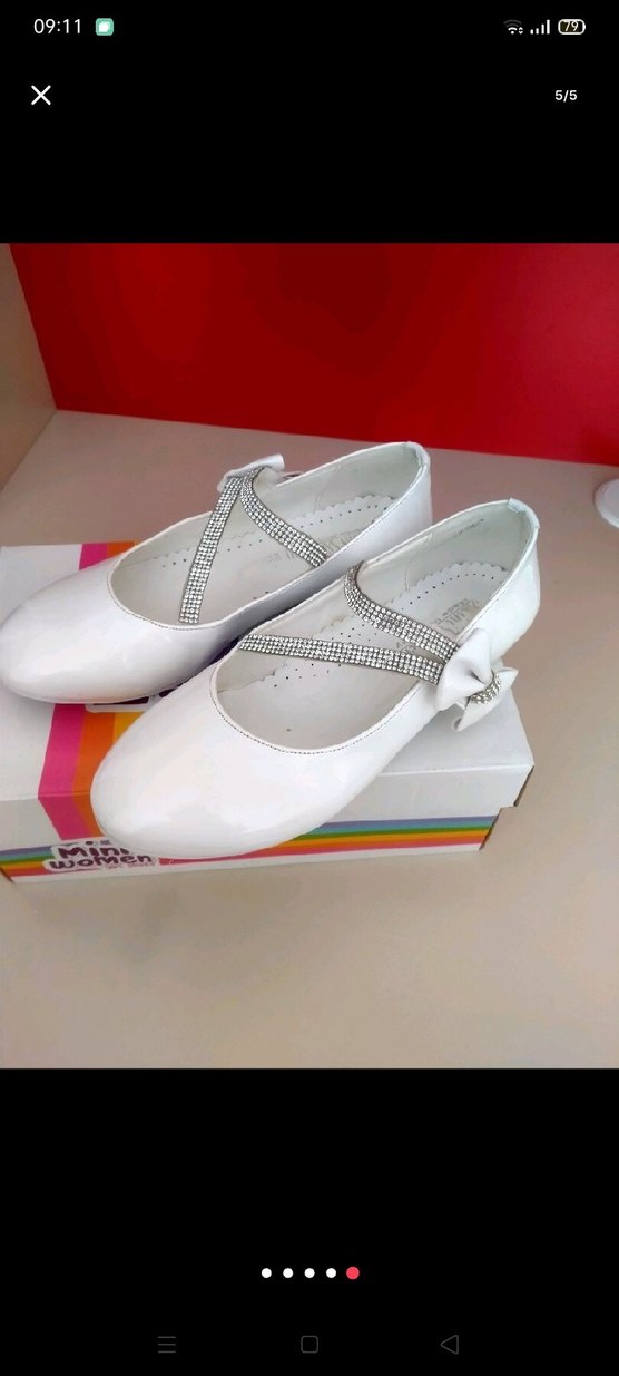 Kız çocukları için beyaz babet ayakkabılar, fiyonk ve taşlı bant detayıyla klasik ve sade bir tasarıma sahiptir.