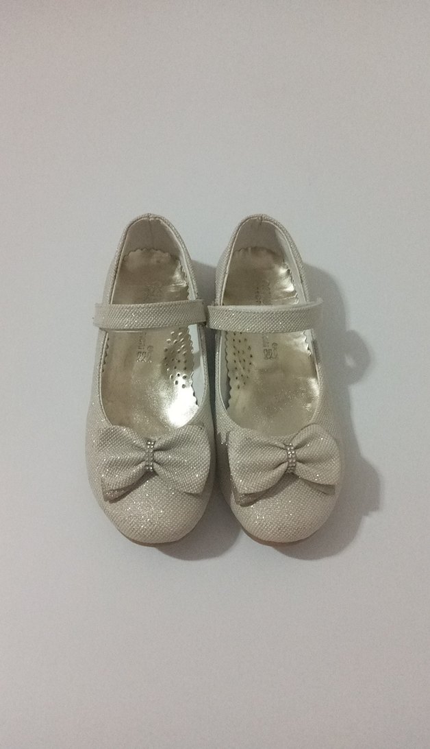 Kız çocuklar için beyaz fiyonklu ve bantlı babet ayakkabılar, rahatlık sağlayan kauçuk tabana sahip. Modern klasik tarzda, hafif dore simli ışıltılı.