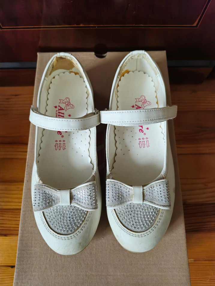 Kız çocukları için beyaz renkte, önden fiyonklu babet ayakkabı. 34 numara. Defosuz.