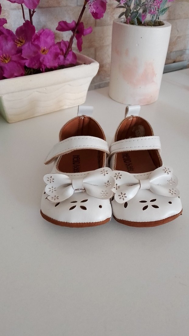 Beyaz, kauçuk malzemeden üretilmiş kız çocuk babetleri, fiyonklu ve sade tasarımlıdır. Hafif renkte ve klasik stile sahiptir.