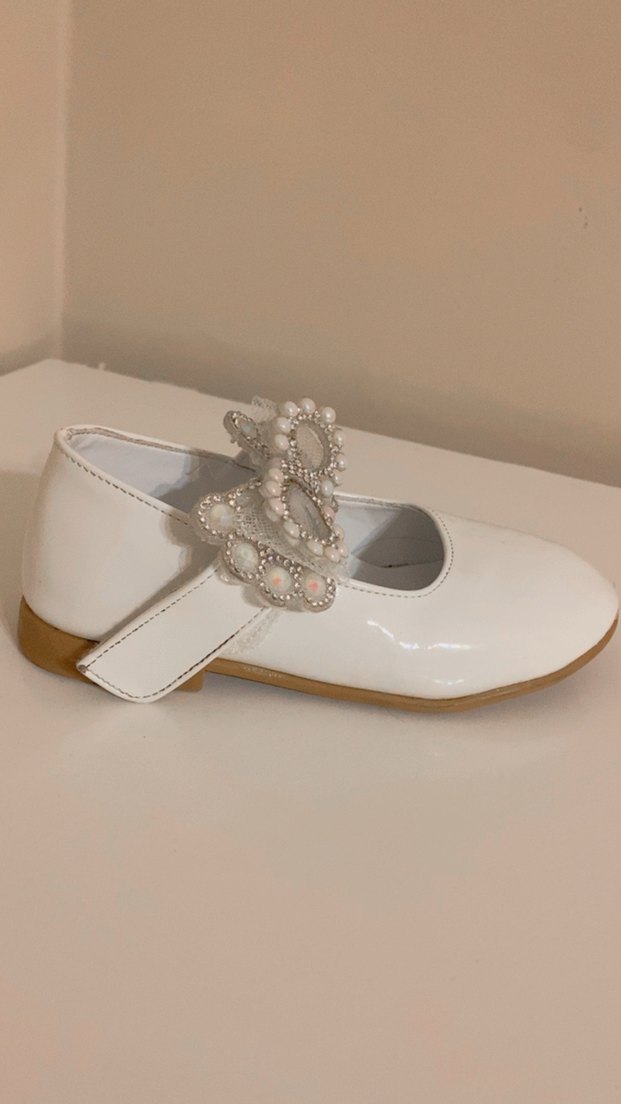 Kız çocukları için beyaz, modern klasik tarzda fiyonklu ve nakış işlemeli babet ayakkabı. Rahatlık için kauçuk tabanlı.