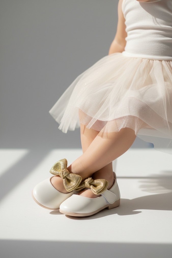 Kız çocukları için beyaz babet ayakkabılar, altın renk fiyonklu ve rahat kauçuk tabanlıdır.