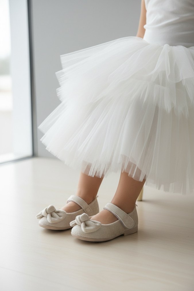 Klasik modern stile sahip, fiyonklu beyaz kız çocuk babetleri. Rahat kauçuk malzemeden üretilmiş, desensiz ve açık renk tasarım.