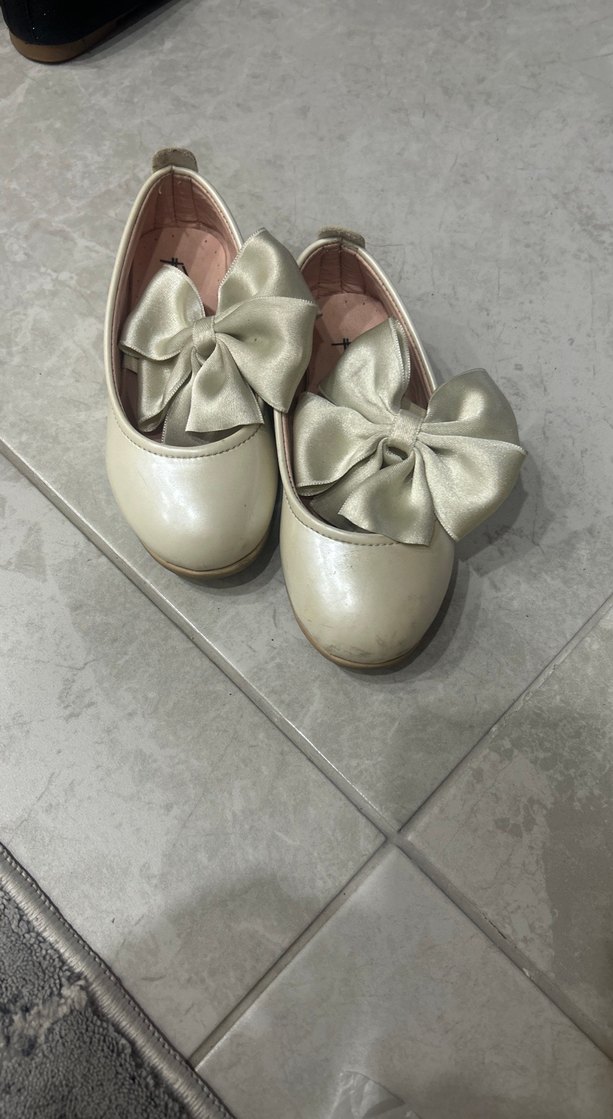 Kız çocukları için beyaz babet ayakkabılar, büyük saten fiyonk ve kauçuk taban ile klasik şıklık ve modern tarzı bir araya getirir.