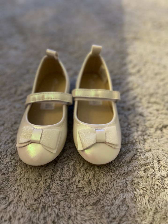Beyaz renkte, fiyonk detaylı ve bantlı kız çocuk babet ayakkabılar. Kauçuk malzemeden üretilmiş, modern klasik tarza sahip, desensiz ve açık renk.