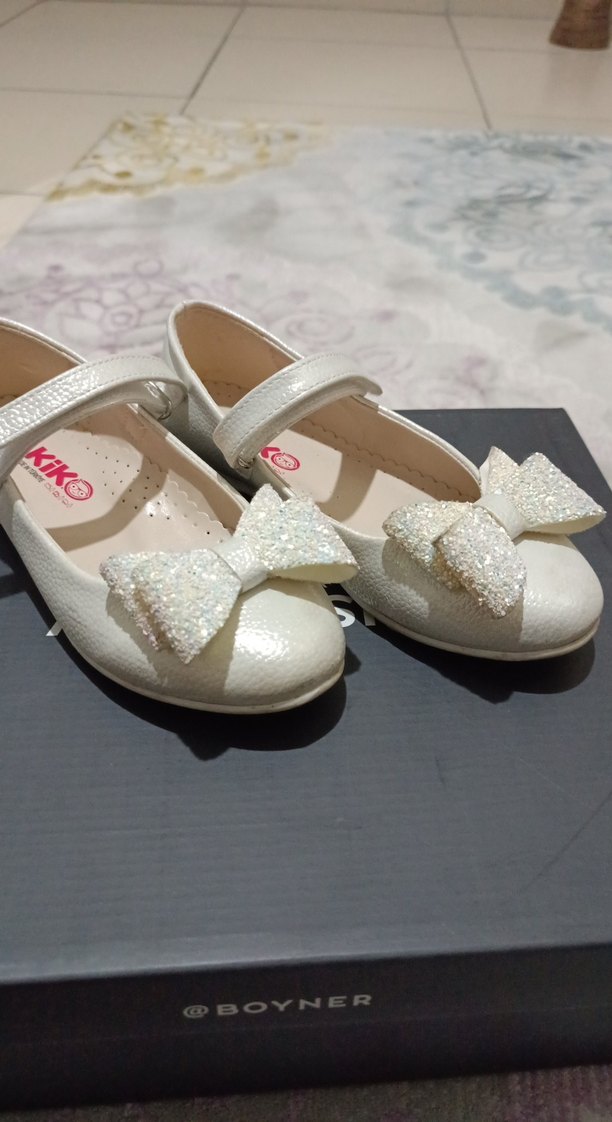 Beyaz renkli, klasik ve sade tasarımlı kız çocuk babet ayakkabılar. Parlak fiyonk detayı ve kauçuk malzeme kullanılmıştır.