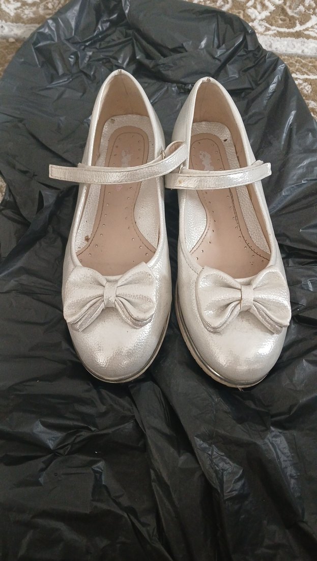 Beyaz, tokalı ve fiyonklu kız çocuk babet ayakkabısı. Kauçuk tabanlı, klasik ve sade tasarıma sahip.