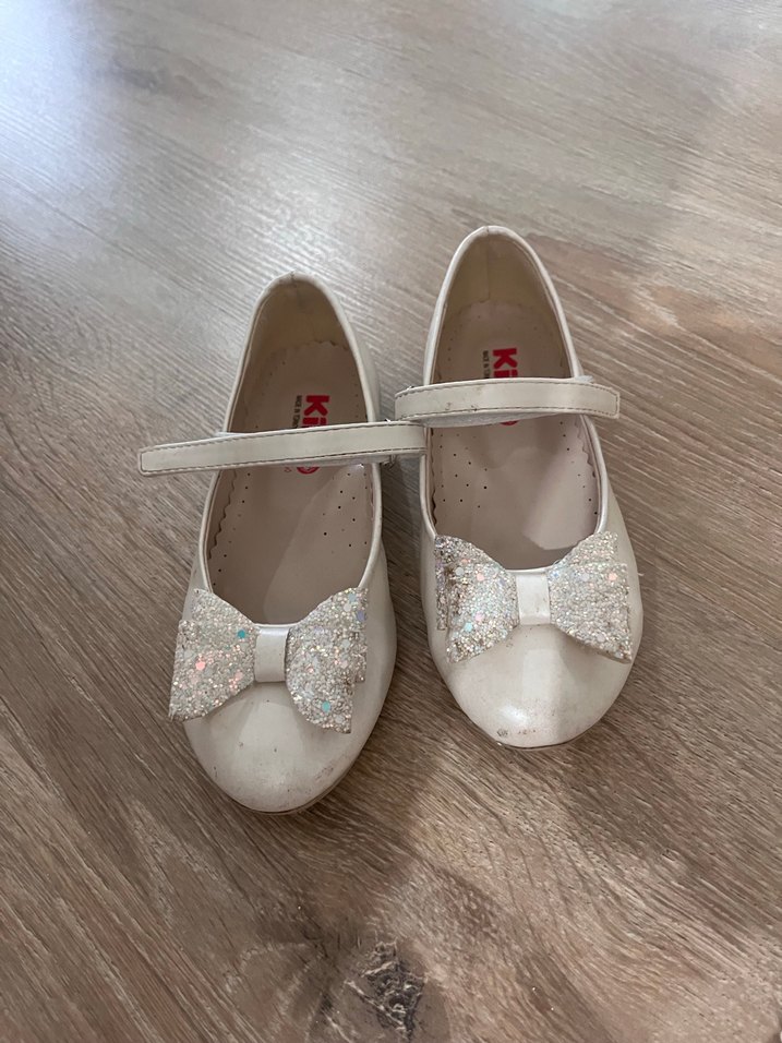 Beyaz kız çocuk babet ayakkabılar, parlak fiyonk detayı ve bantlı, kauçuk malzemeden yapılmıştır. Klasik ve sade tasarım.