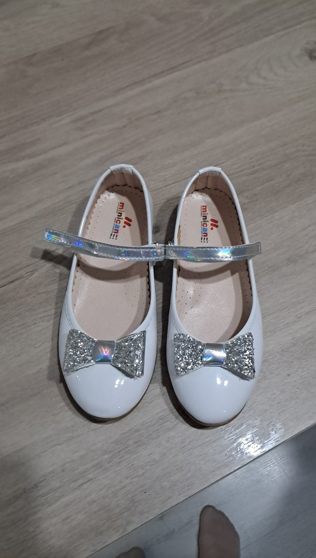 Beyaz renkli, ışıltılı fiyonklu ve bantlı kız çocuk babet ayakkabısı, modern klasik tarzda.Sadece 1st kep töreninde giyildi.