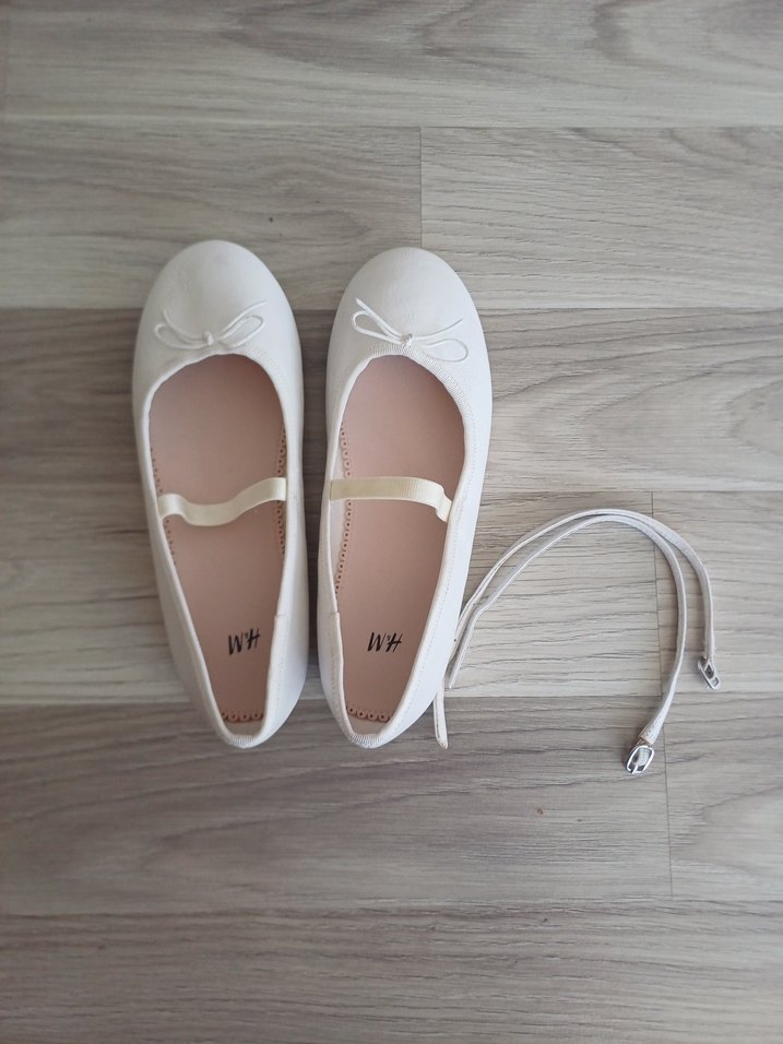 Kız çocukları için beyaz babet ayakkabılar, zarif fiyonk detayı ve düz yüzeye sahiptir. Kauçuk tabanlı, rahat ve sade normcore tarzında. 34 numara. 1 kez gösteride giyildi.