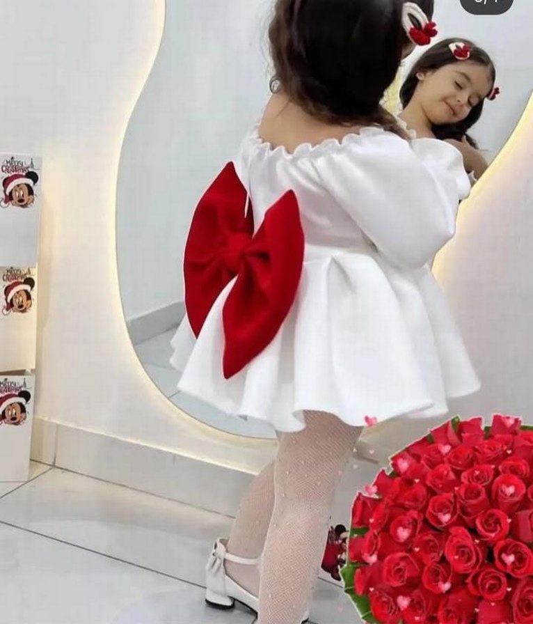 Kız çocukları için beyaz elbise bayram doğum günü bebek Kınası Şık Elbise straplez yakalı ve askılı kollu, işlemeli desenli, sırtında büyük kırmızı fiyonk detaylı istenilen beden dikilir