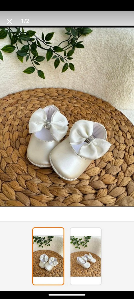 İpek gibi beyaz kumaştan, işlemeli ve fiyonklu kız çocuk ayakkabısı. Bohem tarzda, özel günler için uygundur.